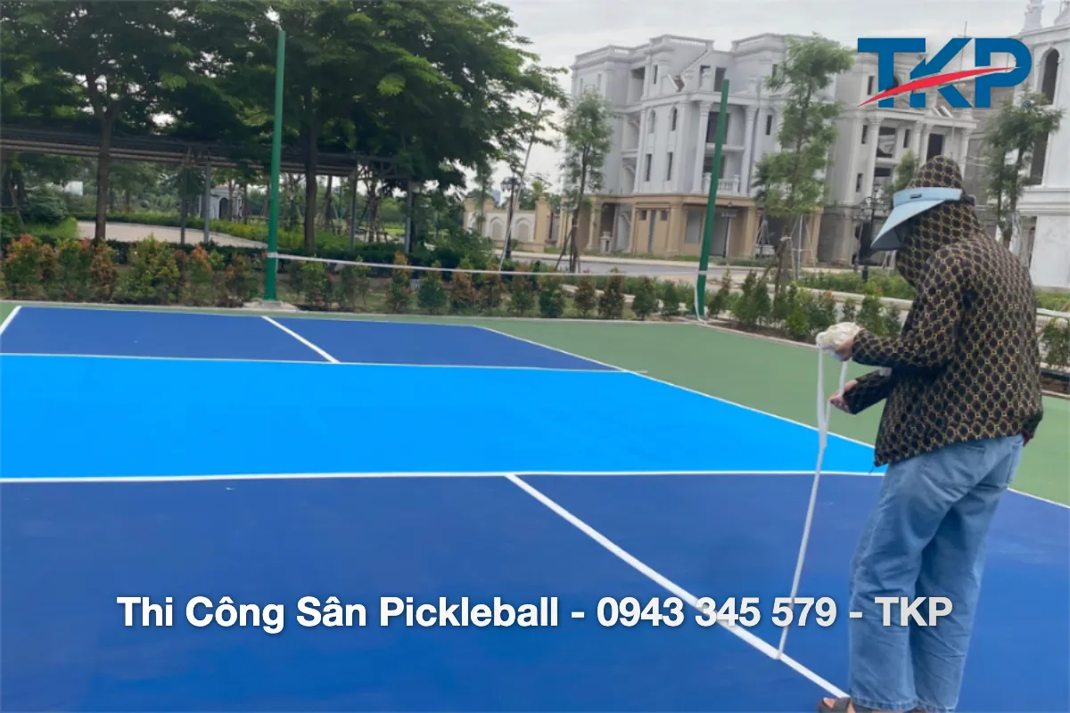 Mặt sân Pickleball phải đảm bảo phẳng mịn, có độ ma sát vừa đủ để người chơi di chuyển linh hoạt mà không lo trượt ngã. Đội ngũ kỹ thuật của TKP sử dụng sơn phủ chuyên dụng có khả năng chống trơn trượt, chống tia UV và chống bám bụi, đảm bảo an toàn tối đa ngay cả khi sân ẩm ướt hoặc ngoài trời nắng nóng.